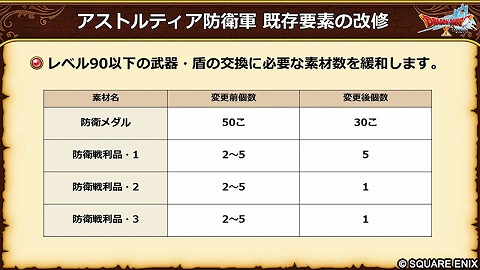 バージョン7.6前期で、アストルティア防衛軍で獲得できる防衛メダルや素材の個数が変更されます。