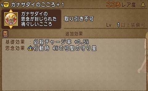 今回入手したガナサダイのこころ+1が、こちらです。思念効果で、行動時4%で弓聖の守り星が付いています。