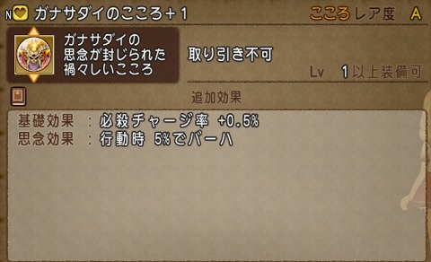 今回入手したガナサダイのこころ+1の思念効果は、行動時5%でバーハが付いていました。