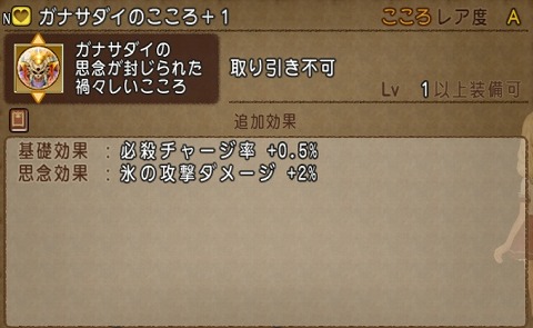 今回入手したガナサダイのこころ+1の思念効果は、氷の攻撃ダメージ+2%でした。