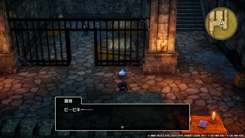 アリアハン城地下1階の東の牢屋の中に、はぐれモンスター「スライム」がいました。スライムに近づくと、保護することができました。
