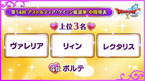 第14回アストルティア・クイーン総選挙!の中間ランキングを紹介しました。上位3名は、ヴァレリア、リィン、レクタリスとなっています。