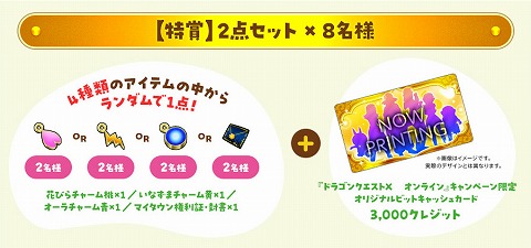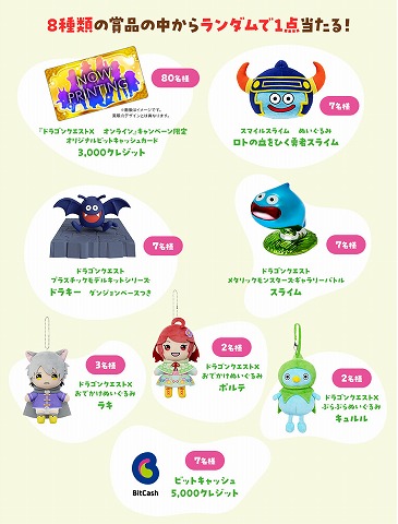 キャンペーン期間中、ビットキャッシュで1度に5000円以上ドラクエ10プレイ中の機種に応じた決済システムでチャージし、特設サイトで応募すると抽選で賞品が当たります。