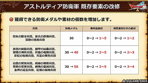アストルティア防衛軍の改修で、戦う兵団によって防衛メダルや素材の量が増えるようになります。また、異星からの侵略軍では新素材が獲得できなくなります。