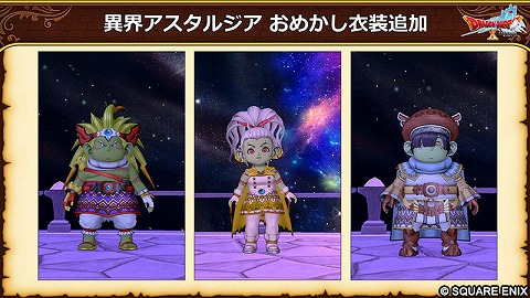 異界のなかまにおめかし衣装が追加されます。カブ、ナンナ、ドルタムの色違い衣装ですね。DQXショップで770円(税込)で販売予定となっています。