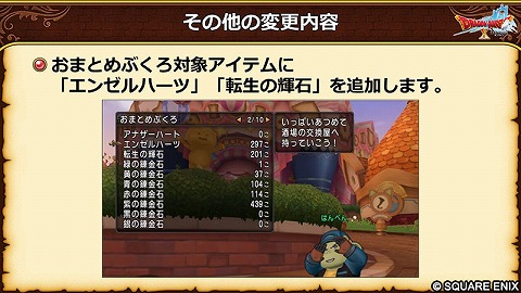 バージョン7.6前期で、エンゼルハーツ、転生の輝石がおまとめぶくろに入ります。倉庫の枠が空くと嬉しいですね。