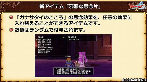 「皇帝の創りしもの」で獲得できる「邪悪な思念片」で、「ガナサダイのこころ」の思念効果を、任意の思念効果に入れ替えられます。好きな思念効果を選べますが、数値はランダムです。