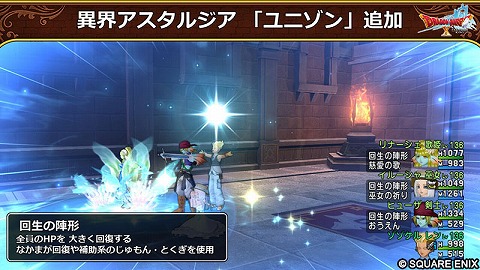 ユニゾン「回生の陣形」を使うと、プレイヤーが全員のHPを回復し、異界のなかまが回復や補助の特技を使ってくれます。