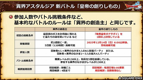 異界アスタルジアに新バトル「皇帝の創りしもの」が追加されます。冒険者4人+異界のなかま4人の8人同盟バトルです。冒険者1人+異界のなかま3人の4人パーティで戦うこともできます。