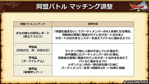 一部のパーティ同盟バトルのマッチング調整が行われます。マッチングが成立しない時に、サポート仲間が加わるみたいですね。