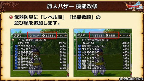 旅人バザーの武器防具の並び順に、「レベル順」「出品数順」が追加されます。レベル順で新武器・防具を探しやすくなりそうです。