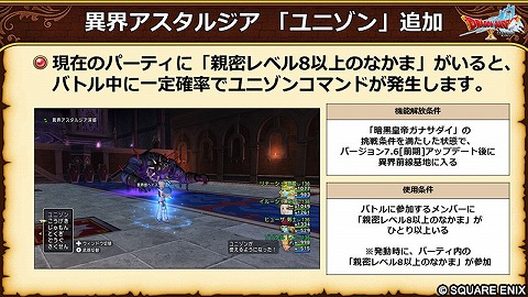 異界アスタルジアに「ユニゾン」という必殺技のようなものが追加されます。ユニゾンは、親密レベル8以上のなかまがいると一定確率で発生します。
