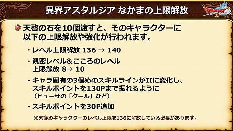 異界アスタルジアで、異界のなかまのレベル上限が136→140に解放されます。親密レベルとこころのレベルの上限も8→10に解放されますね。