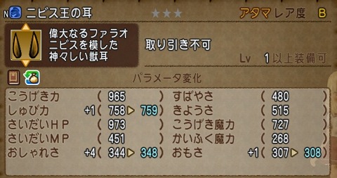 ニビス王の耳は、アタマ装備です。見た目装備なので、パラメータは低くなっています。